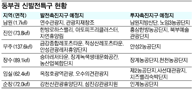 남원시의 경우 연수관광지, 관광지 재창조, 지방산단, 노암3농공단지 조성사업을 추진할 계획이다. 진안군은 한방로하스밸리, 아토피프리클러스트, 자연휴양림, 홍삼한방농공단지, 북부예술관광단지를 조성하고 무주군은 금강종합레포츠타운, 적상산 레포츠타운, 안성관광레저휴양단지, 안성2농공단지 등을 만든다는 복안이다. 장수군은 승마레저타운, 장계 녹색생태문화공간, 농산업복합단지, 장계농공단지, 천천농공단지를 조성하고 임실군은 옥정호광역관광, 오수의견관광지, 제2농공단지, 사선대관광지, 치즈밸리숙박단지 조성사업을 포함시켰다. 순창군도 강천산관광휴양단지, 섬진강관광개발, 인계농공단지 조성사업을 추진해 지역발전을 앞당긴다는 방침이다. 그러나 26곳 가운데 지난해 정식으로 지구 지정을 받은 곳은 단 한 곳도 없었다.
