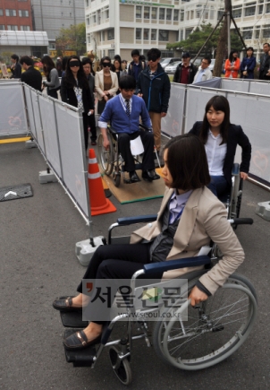 23일 영등포구청 직원들이 장애인들의 입장을 이해하고 그에 맞는 행정서비스 정신을 키우기 위해 구청광장에서 장애체험을 하고 있다.