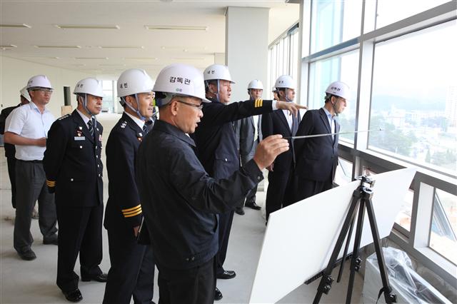 강경량(왼쪽 두번째) 경기지방경찰청장이 30일 경기북부광역행정타운의 경기청 제2청사 건립 현장을 방문해 공사 관계자들을 격려하고 철저한 관리감독과 성실한 시공을 당부하고 있다. 2청사는 대지 2만 6400㎡에 연면적 1만 3530㎡, 지하 2층, 지상 8층 규모로 8월에 준공될 예정이다.