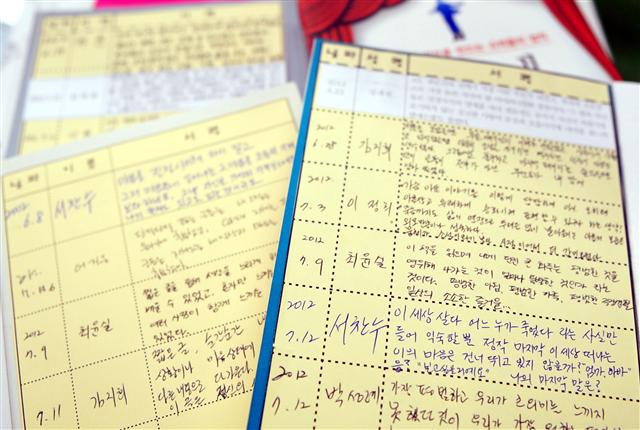 | 박춘희 송파구청장이 지난 5월부터 소통 행정과 독서 문화 확산을 목적으로 추진한 ‘릴레이 독서 운동’이 잔잔한 파장을 일으키고 있다. 구청 직원들이 돌려 본 책의 겉면에 한 줄 서평이 빽빽하게 들어차 있다. 송파구 제공 |