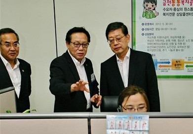 | 김황식(오른쪽) 국무총리와 손건익(왼쪽) 보건복지부 차관이 지난 3일 금천구 통통복지콜센터를 방문해 차성수(가운데) 구청장에게 설명을 듣고 있다. 금천구 제공 |