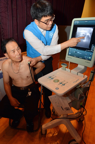 | 어르신, 어깨 아프셨죠? 24일 노원구청 대강당에서 열린 어르신 대상 무료 진료 행사에서 상계백병원 재활의학과 의사가 한 어르신의 어깨 부위를 초음파로 검진하고 있다. 손형준기자 boltagoo@seoul.co.kr |