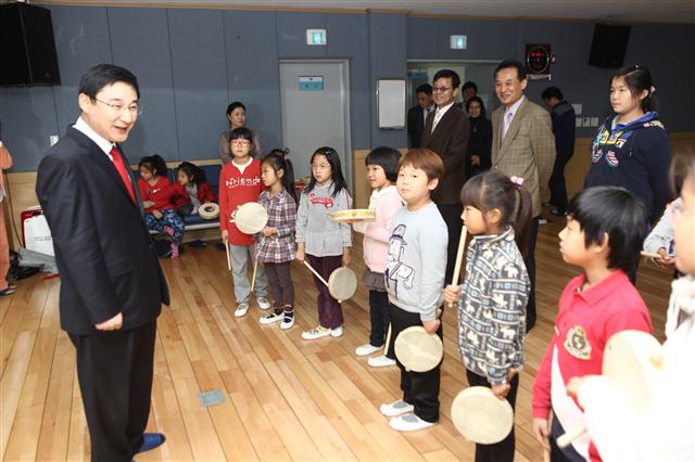 매주 화요일 오후가 되면 도봉구 방학1동 주민자치센터 지하 1층 강당에선 국악을 배우는 어린이들의 소고(小鼓) 소리가 한가득 울려퍼진다. 지난 4월 처음 문을 연 뒤 6개월가량 연습하다 보니 최근에 구청에서 공연을 할 정도로 실력도 늘었다. 스무명 남짓 되는 어린이들에게 두시간씩 소고를 가르치는 유복식씨는 대학에서 배운 국악을 아이들에게 전수하는 게 즐겁기만 하다.