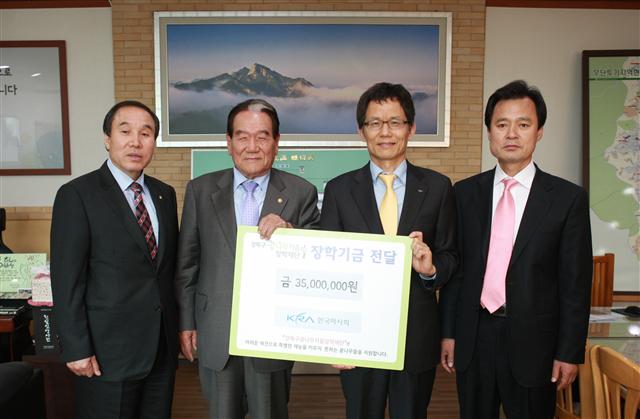 강북구는 8일 한국마사회 강북지사로부터 강북구 꿈나무키움장학재단에 쓰라며 장학금 3500만원을 지원받았다. 이날 오후 열린 장학금 기탁식에는 박겸수 강북구청장, 문성태 강북지사 지사장, 최기석 장학재단 이사장이 참석했다.
