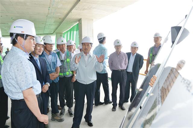 현재 공정률 68%를 보이는 부산국제금융센터에서는 55층까지 승강기를 타고 올라가 공사 진행 상황을 듣고 “부산의 랜드마크가 될 건물인 만큼 단순한 건물이 아닌 작품을 짓는다는 사명감을 가져달라”고 당부했다.