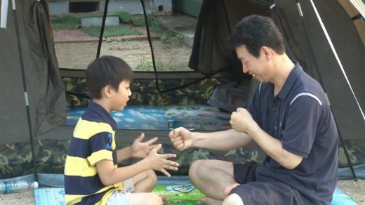 | 지난 10~11일 서울 성북구 개운산 운동장에서 열린 ‘아빠와 함께하는 사랑의 가족 캠프’에 참여한 아버지와 아들이 즐거운 한때를 보내고 있다.성북구 제공 |