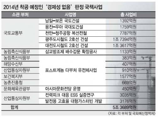 경제성을 생각하면 안 하는 게 낫다고 결론 난 14개 대형 국책 사업(총 사업비 5조 3689억원)을 정부가 내년에 예정대로 추진하기로 했다. 이 중 사회간접자본(SOC)은 6개로, 총 사업비(4조 1949억원)가 전체의 78.1%에 이른다. 박근혜 대통령의 지역 공약인 대전도시철도 2호선 건설(1조 3617억원)도 포함됐다. 정부는 지역균형발전 등을 이유로 내세우지만 과거 방만한 정치적 SOC 투자의 실패 사례들이 많아 국민 세금으로 이뤄진 재정 씀씀이의 적정성을 우려하는 시각이 나오고 있다.|