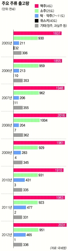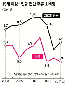 우리나라 인구의 주류 소비량은 점진적으로 줄고 있다. 경제협력개발기구(OECD)가 발표하는 보건 통계(헬스 데이터)에 따르면 2011년 우리나라 15세 이상 인구의 1인당 연간 주류 소비량은 8.9ℓ로 OECD 평균치인 9.4ℓ보다 5.6% 적었다. 우리나라의 주류 소비량은 2003년 이후 한번도 OECD 평균을 넘지 않았다. 소주 가격 인상을 앞두고 일시적으로 주류 소비가 늘었던 2008년을 제외하면 우리나라 성인이 마시는 술의 양은 8ℓ 후반~9ℓ 초반에 머물면서 조금씩 감소하는 추세다.