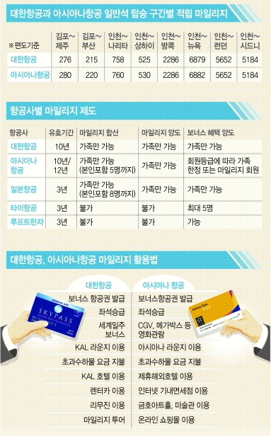 항공사들은 적립한 마일리지를 본인 이외의 사람이 사용할 수 있도록 하고 있다. 항공사별로 운영 방법이 다르지만, 대개 가족으로 한정하는 경우가 많다. 대한항공과 아시아나항공은 직계존비속과 외조부모, 배우자의 부모, 형제 등 가족이 마일리지를 합산해 사용할 수 있도록 하고 있다. 대학원생 김성민(34)씨는 지난해 1월 교환학생으로 독일로 6개월간 유학을 가며 가족 합산 마일리지 제도를 통해 왕복 항공권을 구입한 마일리지 고수족이다. 김씨는 “2년 전 결혼할 때 항공사 제휴 신용카드로 3000만원 정도 사용했더니 5만점 정도가 쌓였다. 거기에 아내가 쌓은 마일리지 3만점 정도를 합산한 뒤 7만점을 공제해 인천~프랑크푸르트 구간 왕복 항공권을 구매했다”면서 “마일리지로 보너스 항공권을 구매해 경비를 상당히 아낄 수 있었다”고 전했다.