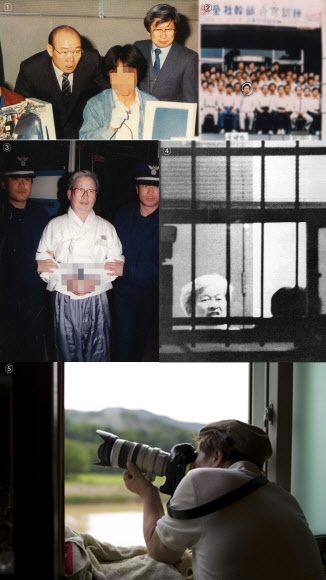 | ① 지난 1984년 유 전 회장(오른쪽)이 세모 전신인 삼우 트레이딩 부천공장을 방문한 전두환 전 대통령과 함께 작업광경을 지켜보는 모습. ② 삼우트레이딩 간부합숙훈련때 기념촬영사진. ③ 지난 1992년 4월 17일 세모 사기사건 선고공판에 참석하는 유 전 회장. ④ 오대양사건과 관련해 대전지검에서 조사를 받는 유 전 회장. ⑤사진작가 ‘아해’로 활동하는 유 전 회장. 연합뉴스 |