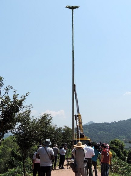 | 김해 찾아온 손님… 일본 황새의 인공 둥지 경남 김해시가 화포습지로 날아든 천연기념물 199호인 일본 황새가 안정적으로 정착할 수 있도록 최근 설치한 인공 둥지가 25일 모습을 드러내고 있다. 20m짜리 대 위에 직경 2m 크기로 만들어진 둥지는 화포습지 생태공원에 있는 생태학습관 인근 둑길에 조성됐다. 김해 연합뉴스 |