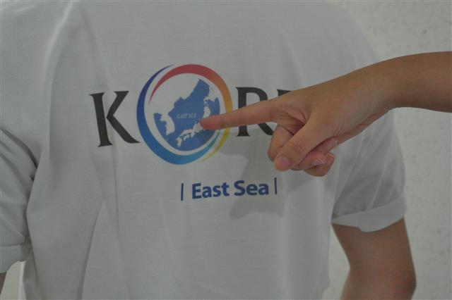 해양조사원이 직접 디자인한 동해 티셔츠에는 우리나라를 뜻하는 영문명 ‘KOREA’ 안에 우리나라와 일본 지도 사이 바다를 영문명 동해로 표시했다. 울릉도와 독도도 그려져 있다.