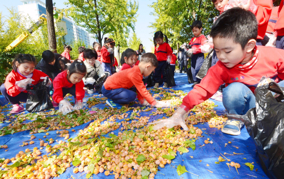 | 냄새 나면 어때요~ 몸에 좋은 은행인데 8일 서울 송파구 위례성대로에서 열린 은행나무 열매 줍기 체험행사에 참여한 어린이들이 송파구 직원들이 고소작업차와 장대를 이용해 떨어뜨린 은행을 줍고 있다. 참여한 주민들이 수확한 은행을 가져가고 나머지는 지역 노인정 등 사회복지시설에 나눠 줄 예정이다. 손형준 기자 boltagoo@seoul.co.kr |