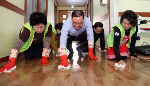 정홍원 국무총리가 주말인 지난 6일 오전 세종시 전의면에 있는 한 장애인 복지시설을 찾아 세종시 여성봉사단원들과 함께 마룻바닥을 걸레로 닦으며 봉사활동을 하고 있다.