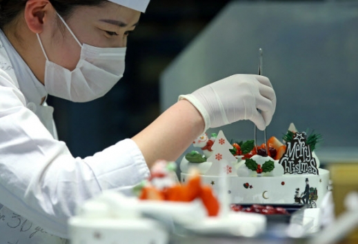 크리스마스를 이틀 앞둔 23일 오후 서울 서초구 한 빵집에서 제빵사가 성탄절 케이크를 만들고 있다.