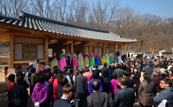 | 정릉 재실 복원… 반백년 만의 귀환 25일 오전 서울 성북구 정릉에서 열린 ‘정릉 재실 복원 기념식’에서 참석자들이 공연을 관람하고 있다. 문화재청 조선왕릉관리소는 1960년대 없어졌던 재실(제사를 준비하는 곳)을 복원해 이날 처음 일반인에게 공개했다. 박지환 기자 popocar@seoul.co.kr |