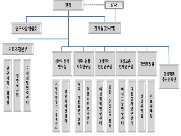 △기획조정본부장 김태홍 △성인지정책연구실장 유희정 △가족·평등사회연구실장 장혜경 △여성권익·안전연구실장 이수연 △여성고용·인재연구실장 박성정 △창의행정실장 권주미 △성별영향평가·통계센터장 김경희 △성인지예산센터장 조선주 △가족·다문화연구센터장 김이선 △평등사회연구센터장 안상수 △여성권익연구센터장 이미정 △안전·건강연구센터장 장미혜 △여성고용연구센터장 김종숙 △여성인재연구센터장 오은진 △양성평등추진전략단장 최유진 △연구기획·평가팀장 전기택 △경영혁신팀장 이규춘 △국제개발협력센터장 김은경 △경영관리팀장 김관옥 △정보재무팀장 직무대리 유명희 △검사역 이현화