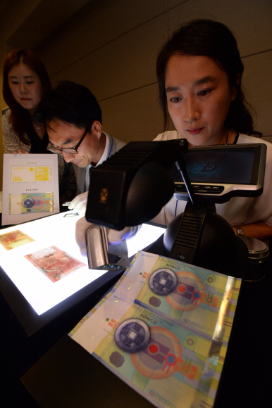 | “위조지폐, 딱 보면 압니다” 8일 오후 서울 중구 대한상공회의소에서 열린 한국조폐공사 수출상품설명회에 참석한 공사 직원들이 지폐 위·변조 방지 기술을 시연하고 있다. 도준석 기자 pado@seoul.co.kr |