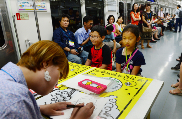 | 캐리커처 그려 주는 만화 열차 제18회 부천국제만화축제 개막을 기념해 12일 서울도시철도공사와 한국만화영상진흥원 주관으로 열린 캐리커처 체험 행사에서 작가들이 승객들의 캐리커처를 그려 주고 있다. 이날 7호선 이수역~삼산체육관역 구간에서 오후 2시부터 1시간 동안 ‘만화 열차’가 임시 운행됐다.강성남 선임기자 snk@seoul.co.kr |