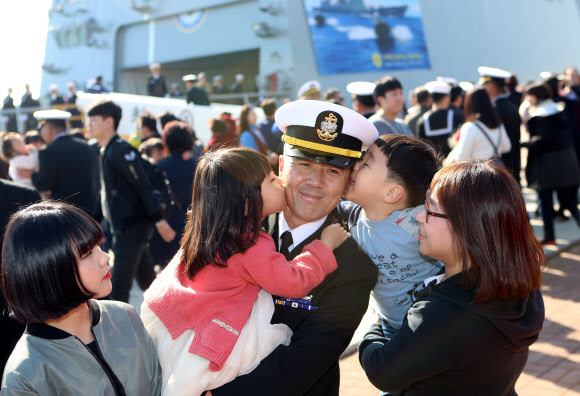 | “아빠 무사히”… 청해부대 20진 아덴만으로 김상훈 상사가 3일 부산 해군작전사령부 작전기지에서 최영함에 오르기 전 큰딸(맨 왼쪽)과 부인(맨 오른쪽)이 지켜보는 가운데 둘째·셋째 아이들로부터 작별 뽀뽀를 받고 있다. ‘아덴만 여명작전’의 주역인 최영함은 이날 청해부대 20진을 태우고 출항, 아덴만 해역에서 선박호송과 해적퇴치 등의 임무를 수행한다. 연합뉴스 |