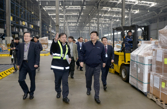 | 주형환 산업, 인천공항 수출화물 터미널 방문 주형환(앞줄 오른쪽) 산업통상자원부 장관이 17일 인천공항 수출화물 터미널을 방문해 통관·선적 과정을 점검하고 있다. 주 장관은 터미널 관계자들에게 수출기업들이 한·중 자유무역협정(FTA)을 보다 손쉽게 활용할 수 있도록 신속한 통관·선적과 원산지 증명 등을 적극 지원해 줄 것을 당부했다. 산업통상자원부 제공 |