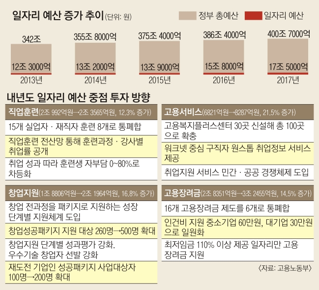고용노동부와 교육부, 중소기업청은 31일 정부세종청사에서 이 같은 내용을 담은 ‘2017년 일자리 예산안’ 세부 내용을 발표했다. 내년도 일자리사업 예산 규모는 17조 5229억원으로, 올해 15조 8245억원보다 10.7% 늘어난다. 특히 한국개발연구원(KDI)의 일자리 분야 심층평가에서 중장기 고용효과가 높다고 평가된 고용서비스(21.5%), 창업지원(16.8%), 직업훈련(12.3%)에 대한 투자를 크게 늘렸다.