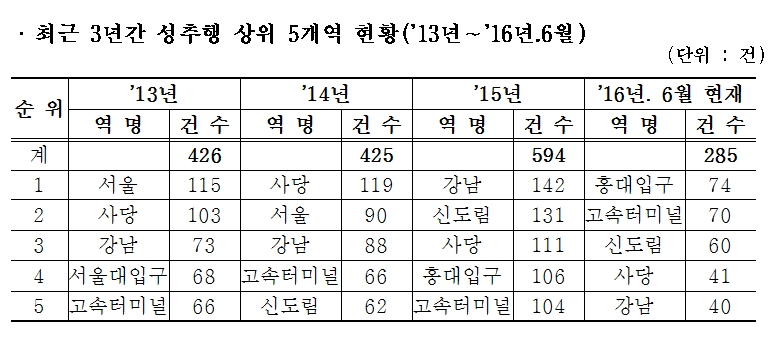 최근 3년간(’13년~’16년 6월) 서울메트로 성추행 상위 5개역 총 적발건수는 1,730건으로 매년 증가 추세로 나타내고 있으며 이용승객이 많은 2호선 역에서 많이 발생하는 것으로 나타났다.