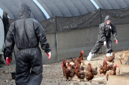 | 울산 AI 방역 전북 군산발 고병원성 조류인플루엔자(AI)가 전국적으로 확산될 조짐을 보이는 가운데 최초 발생 농가로 지목된 군산의 농가 닭 수십 마리가 울산시에도 유통된 것으로 드러나 방역에 비상이 걸렸다. 5일 울산 울주군 서생면의 한 농가에서 살처분에 나선 공무원이 닭을 잡고 있다. 울산 연합뉴스 |
