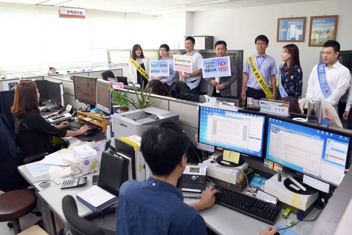 | 감사담당관 자치행정과 직원 10여명’음주운전을 하지 맙시다’’음주운전은 범죄행위’등 음주운전 근절 구호를 외치며 어깨띠와 피켓을 들고 각 부서를 방문하여 음주운전 근절을 당부했다. (광주시 제공) |