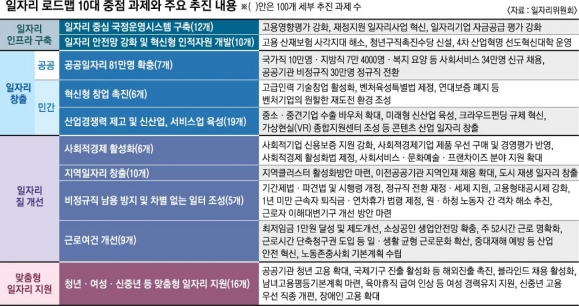 이외에도 공공부문 일자리 81만개 창출, 노동조건 개선과 비정규직 남용 방지를 통한 일자리 질 개선, 최저임금 1만원, 노동시간 단축 등 정부 출범 이후 추진돼 온 주요 일자리·노동 정책도 로드맵에 담겼다. 고용영향평가 강화 및 일자리 우수기업에 대한 세제·금융지원 등 일자리 창출을 위한 국정시스템 재설계 방안도 포함됐다.