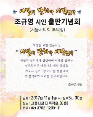 서울시의회 조규영 부의장(더불어민주당, 구로2)은 ‘사람의 잔치가 시작됐다’의 출판기념회를 11월 1일 오후 5시 30분 서울시청 신청사 8층 다목적홀에서 개최한다.