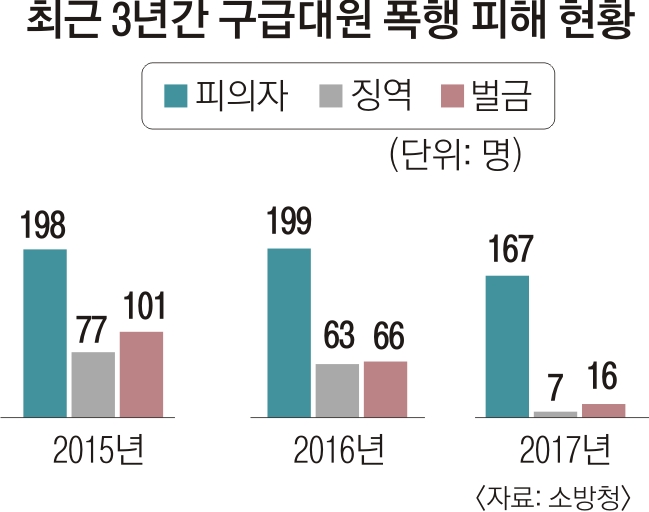 3일 소방청에 따르면 최근 3년(2015∼2017년)간 모두 564건의 구급대원 폭행사건이 발생해 183명이 벌금형, 147명이 징역형을 선고받았다. 현재 134명이 수사·재판 중이다. 해마다 200명 가까운 이들이 구급대원을 폭행하는 셈이다. 지난해의 경우 폭행 피의자(167명)의 92%가 술에 취한 상태에서 범행을 저질렀다고 소방청은 설명했다.