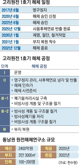 국내 첫 상업용 원자력발전소가 2017년 6월 19일 영구 정지했다. ‘고리 1호기’가 수명을 다하면서 원전 해체에 대한 관심도 높아졌다. 국제원자력기구(IAEA)는 세계 원전해체시장 규모를 440조원으로 추산한다. 정부가 원전 해체를 위해 2014년 원전해체연구센터 설립을 꾀했지만 2016년 예비타당성 조사 결과 낮은 경제성 탓에 백지화했다. 이후 문재인 대통령이 2017년 6월 19일 고리 1호기 영구 정지 선포식에서 ‘동남권 원전해체연구소 설립’ 의지를 밝히고 나서 지방자치단체의 유치전도 재점화됐다. 경북 경주시, 울산시, 부산시가 유치에 나섰다. 오는 3월 산업통상자원부가 원전해체산업 종합육성전략 발표 때 입지를 결정할 전망이다. 14일 산업부에 따르면 종합육성전략엔 국내 해체산업 역량 분석, 육성 전략, 인력 양성 및 기업 지원 등 산업육성 과제, 동남권 원전해체연구소의 입지 및 규모 등을 담을 예정이다.이와 관련, 한국수력원자력은 고리 1호기의 내부 방사성물질 조사와 최종 해체계획서를 작성하고 있다. 한수원은 최종 계획서를 2020년 6월까지 마무리한 뒤 원자력안전위원회에 내고 승인을 받으면 사용후핵연료 반출, 비방사선 구역 철거 작업에 들어간다. 이후 방사선 구역 철거에서 나올 폐기물을 보관할 폐기물처리시설을 건설하게 된다. 2026년 시작되는 제염·절단·철거 작업이 2030년쯤 마무리되면 2031~2032년 부지 복원 작업을 벌인다.
