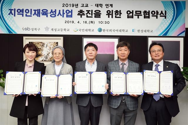 | 박지혜(왼쪽부터) 한국외대 입학처장, 심숙진 계성고 교장, 손정수 성북구 부구청장, 조세홍 한성대 교무처장, 이석환 국민대 교무처장이 지난 16일 ‘고교-대학 연계 지역인재육성사업’ 추진을 위한 업무협약을 맺고 기념촬영을 하고 있다. 성북구 제공 |