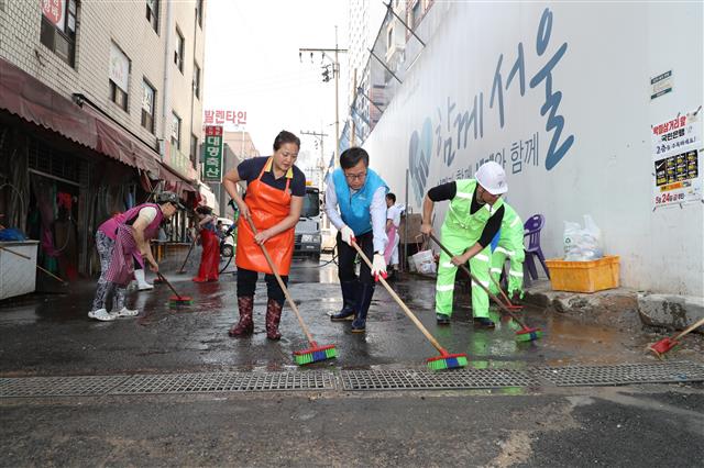 “독산동 우시장은 오랜 시간 이곳을 지켜온 지역의 자랑입니다. 하지만 많은 사람이 찾아오는 명소로 거듭나기 위해서는 구성원들의 노력이 필요합니다.”지난달 24일 서울 금천구 독산동 우시장 일대는 상인회, 구청 직원 등 80여명이 모여 아침부터 분주했다. 매주 금요일 아침에 진행하는 물청소 때문이다. 이날은 유성훈 금천구청장도 동참했다. 30여분에 걸쳐 시장 바닥에 묻은 핏물, 우지 등 부산물을 친환경세제와 솔로 싹싹 씻어내리자 코를 자극하던 비릿한 냄새는 상쾌한 아침 공기 속으로 사라졌다.