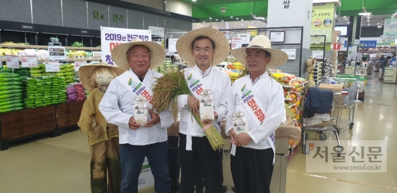 | 27일 이항진(가운데)시장이 농협하나로클럽 양재점에서 올해 첫 수확한 햅쌀 출하 행사를 하고 있다. (여주시 제공) |