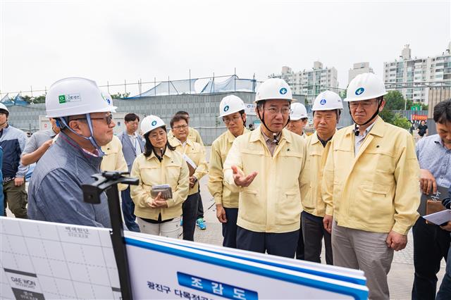 다음으로 방문한 곳은 광장동 체육시설부지에서 한창 공사 중인 ‘다목적 공공복합시설’이었다. 구는 이 부지 지상에는 체육공원을 조성하고 지하에는 대형 폐기물 집하장과 환승주차장을 건립할 예정이다. 구 관계자는 “광진구에는 서울 25개 자치구 중 유일하게 쓰레기 임시처리시설이 없어 인접 구 시설을 이용해 왔다”면서 “최근 성동구 등에서 정식으로 쓰레기 처리를 거부하는 요청 공문이 왔기 때문에 우리 구 자체적으로 시설을 건립할 수밖에 없는 상황”이라고 말했다. 김 구청장은 공사 관계자들을 격려한 뒤 “주민들의 반대가 심했던 만큼 악취가 전혀 발생하지 않도록 시설 보완에 각별히 신경써 달라”고 주문했다.