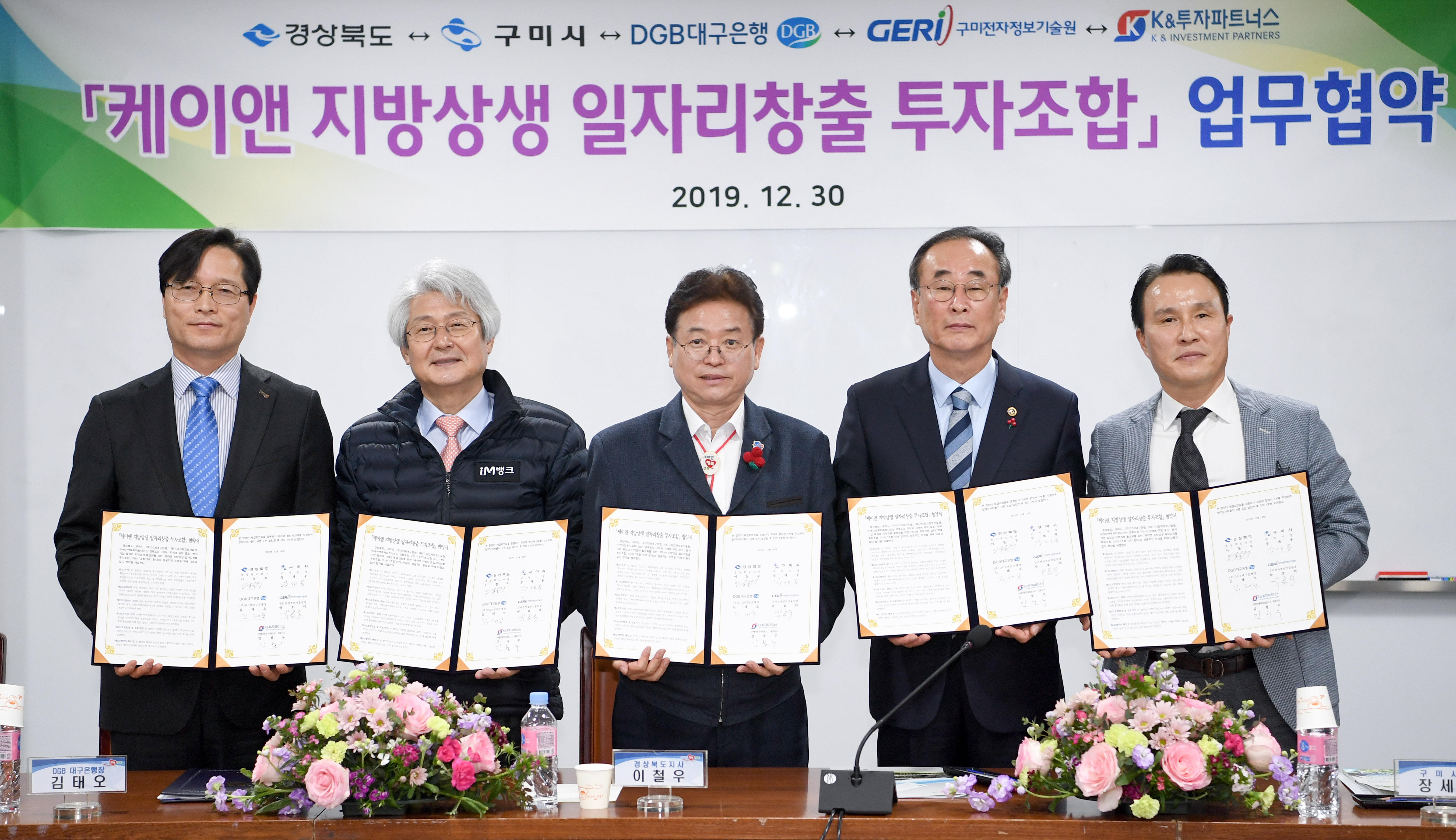 경북도는 30일 오전 도청 회의실에서 구미시, DGB대구은행(이하 대구은행), 구미전자정보기술원, ㈜케이앤투자파트너스와 함께 ‘케이앤 지방상생 일자리 창출 투자조합 결성을 위한 협약’을 체결했다.