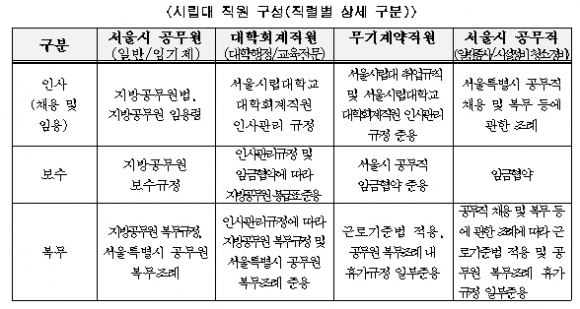 서울시립대는 채용에서 ‘서울시 공무원, 대학회계직원(대학행정·교육전문), 무기계약직원, 서울시 공무직(일반종사·시설정비·청소경비)’ 4가지의 직렬로 구분하고 있다. 서울시 공무원을 제외한 대학회계직원, 무기계약직, 공무직은 서울시립대 총장이 임용하여 시립대 규정에 따라 보수, 인사, 복무 관리를 하고 있다.