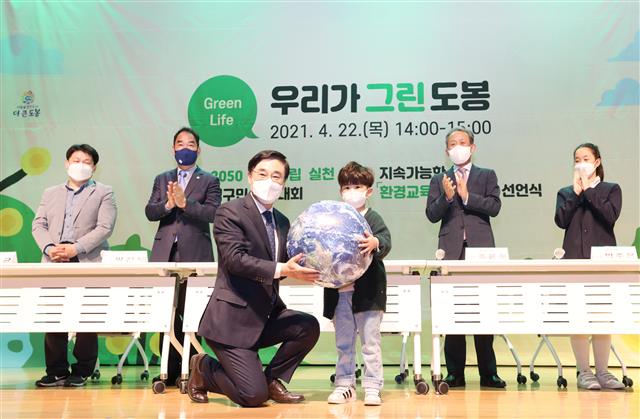 | 이동진(앞줄 왼쪽) 서울 도봉구청장이 구청에서 열린 ‘2050 탄소중립 실천 범구민 결의대회 및 환경교육도시 선언’ 행사에서 한 어린이와 함께 푸른 지구 모형을 들고 기념 사진을 찍고 있다. 도봉구 제공 |