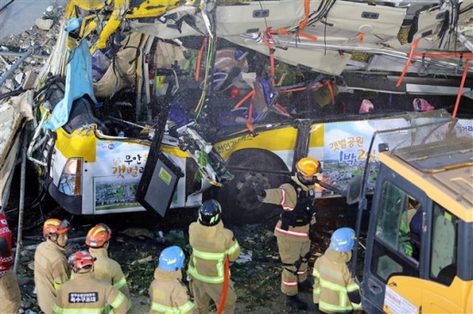 뒤쪽에 있던 17살 고교생 등 9명 사망 소방당국은 애초 매몰된 버스에 운전기사를 포함해 12명이 탄 것으로 추정했다. 그러나 처참하게 찌그러진 버스 차체가 중장비 작업으로 드러나면서 매몰자들이 추가로 발견됐다.