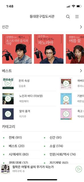 “귀로 읽는 책, 이제 쉽고 편리하게 들어요”동대문구립도서관은 ‘오디언 도서관 앱’을 통해 현재 800여 종의 오디오북을 제공하고 있다고 18일 밝혔다. 최신 출시 작품을 비롯해 베스트셀러와 소설, 시·에세이, 인문·사회·역사 등 분야별로 다양한 오디오북을 대여할 수 있다.