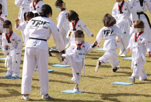13일 충북 진천군 국가공무원 인재개발원 운동장에서 아프가니스탄 특별기여자의 자녀들이 태권도를 배우고 있다.