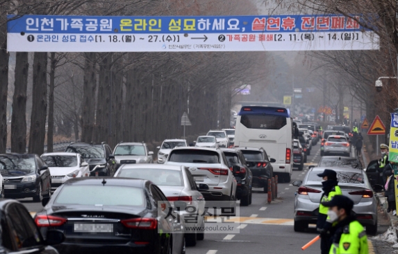 | 설 연휴 추모공원 폐쇄에 ‘미리 성묘’ 차량 북적 7일 인천 부평구 인천가족공원 입구가 꼬리에 꼬리를 물고 몰려드는 차량으로 붐비고 있다. 지자체들이 코로나19 확산 방지를 위해 설 연휴인 오는 11~14일 가족공원 등을 폐쇄하기로 하면서 전국 추모공원 등은 미리 성묘에 나선 시민들로 북적였다. 박윤슬 기자 seul@seoul.co.kr |