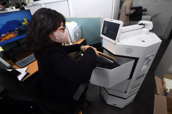 | 문서 배달 왔습니다 서울시 직원이 22일 시청에서 서울시 1호 로봇 주무관인 ‘로보관’이 배달한 문서를 꺼내고 있다. 로보관은 문서 배달·민원 안내 등의 업무를 지원하며 엘리베이터를 타고 각 층을 이동할 수 있다. 안주영 전문기자 |