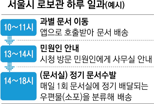 오후 1~2시에는 서울시청을 방문한 민원인을 대상으로 사무실 길 안내를 진행한다. 오후 2시부터는 서울시 문서실에 도착하는 각종 정기 우편물을 각 부서로 배송하는 업무를 맡는다. 로보관은 4시간 동안 30~40개 사무실로 문서 배달을 할 수 있다. 시 관계자는 “민원 업무 수행은 로보관의 고유 업무인 문서 수발 일정을 고려해 향후 탄력적으로 운행할 계획”이라고 밝혔다.