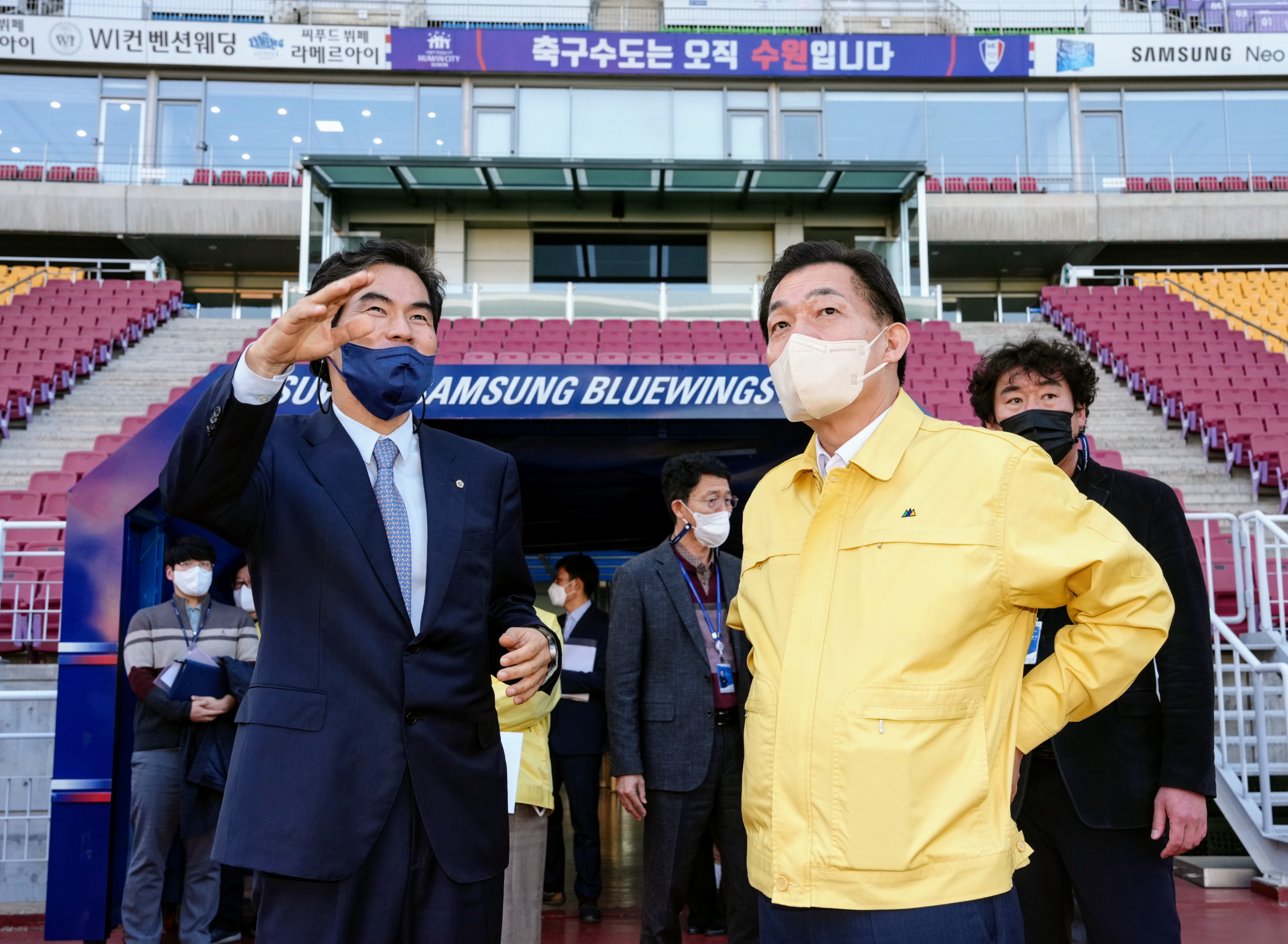 | 이재준(오른쪽) 수원시장이 23일 오후 2022 카타르 월드컵 한국 대표팀 응원전이 열리는 수원월드컵경기장에서 이민주(왼쪽) 경기도수원월드컵경기장관리재단 사무총장과 함께 안전대책을 논의하고 있다. 수원시 제공 |