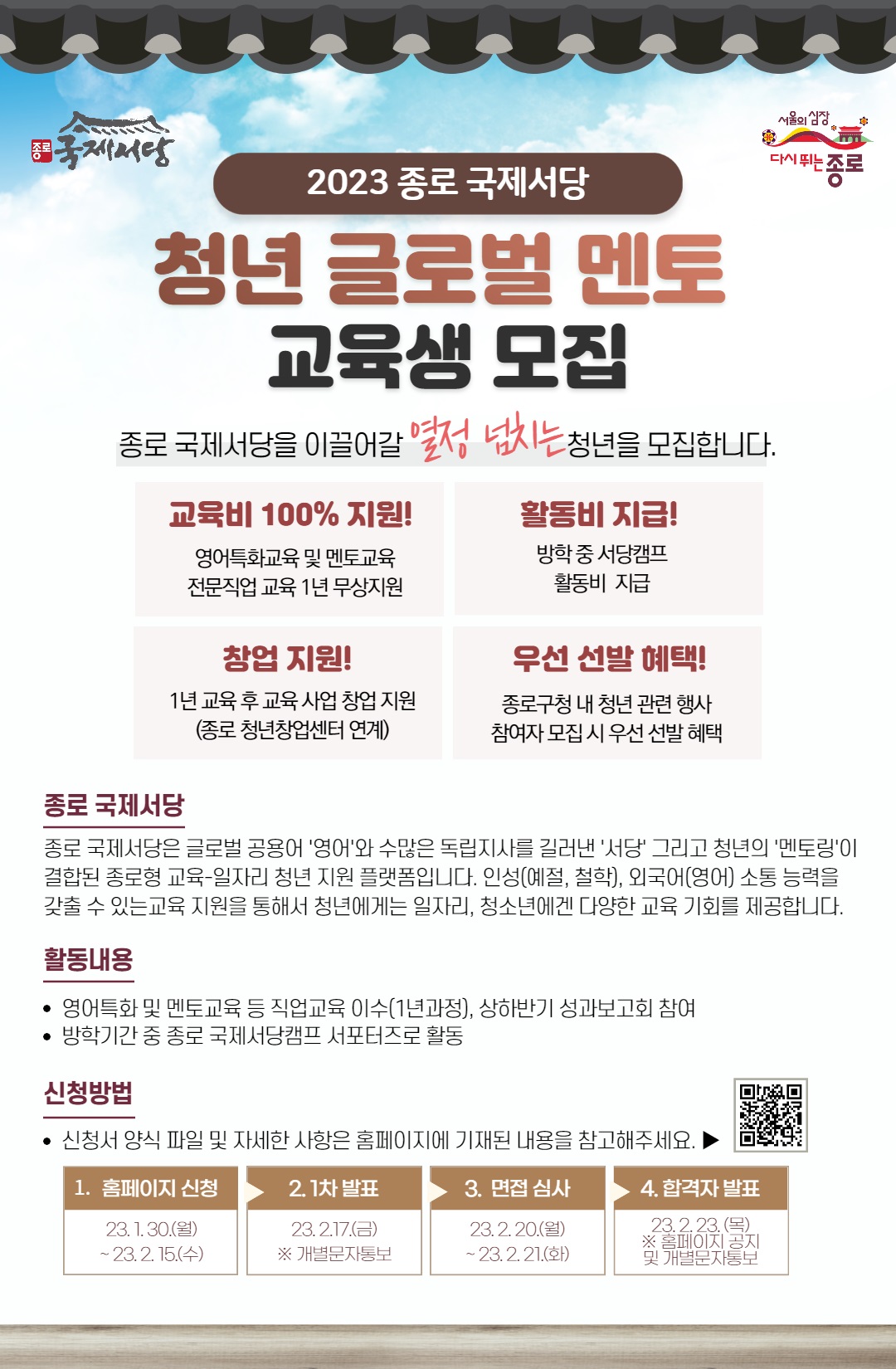 또 종로 청년창업센터와 연계해 교육 사업 창업을 지원받고 방학 기간 열리는 국제서당캠프 서포터즈 활동비도 받아볼 수 있다. 구에서 여는 각종 청년 행사 참여자 모집 시에도 우선 선발 혜택이 주어진다.