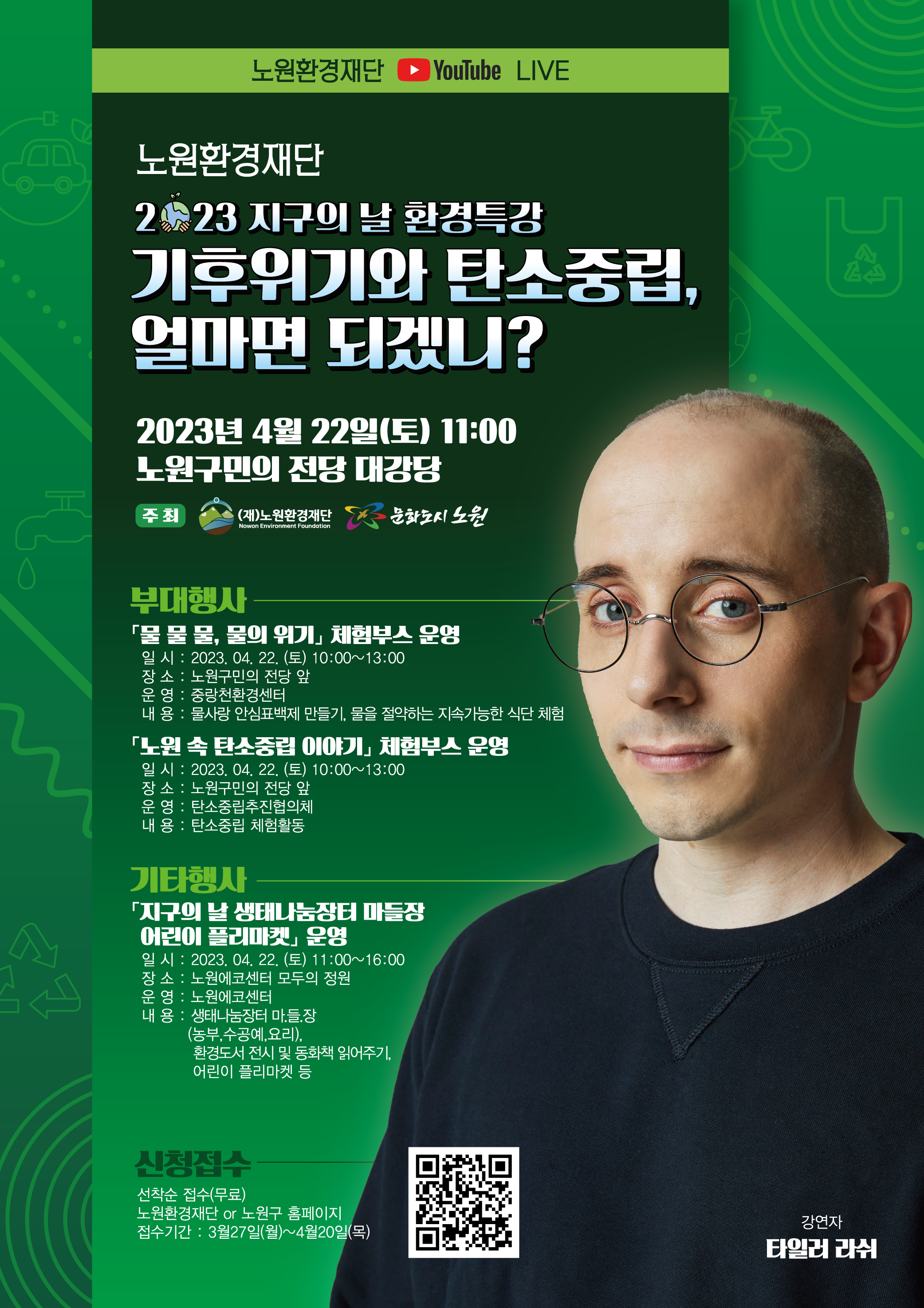 22일 오전 11시 노원구민의 전당 대강당에서 타일러 라쉬의 무료 환경 특강이 열린다. 다양한 방송 프로그램에 출연한 타일러 라쉬는 2016년부터 세계자연기금의 홍보대사로 활동하고 있다. 책 ‘두 번째 지구는 없다’를 발간하는 등 환경 문제의 심각성에 대해 꾸준히 알려왔다.