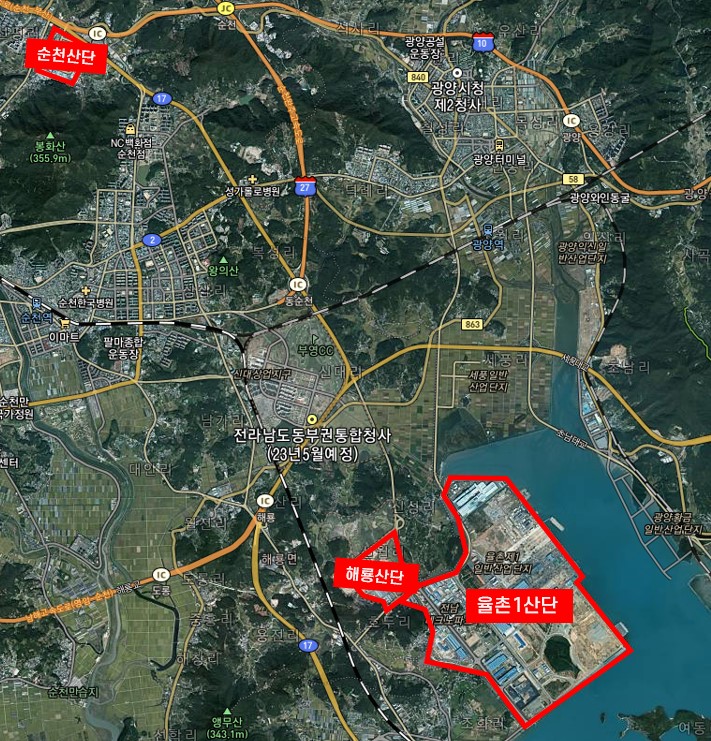 순천 율촌1산단과 해룡산단, 순천산단 등에 대기업이 몰려들면서 순천이 미래 첨단산업을 견인하는 비약적 발판을 마련하고 있다.20일 순천시에 따르면 국토교통부·산업통상자원부 등 관계부처 합동으로 추진한 ‘거점산업단지 경쟁력강화사업’에 율촌1산단, 해룡산단, 순천산단이 선정됐다. 지난 14일 한화에어로스페이스㈜의 우주 발사체 단 조립장 부지(500억원 규모)로 율촌1산단이 선정된 데 이은 연타석 홈런이다.